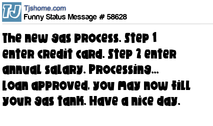 X The new gas process. Step 1 enter credit card. Step 2 enter annual salary. Processing... Loan approved, you may now fill your gas tank. Have a nice day.