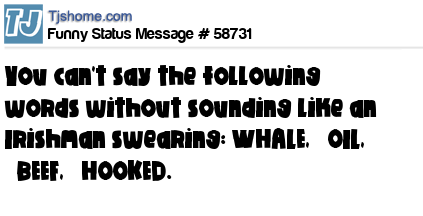 - # 204943 Talk like a drunken Irishman and say "Whale Oil Beef Hooked."