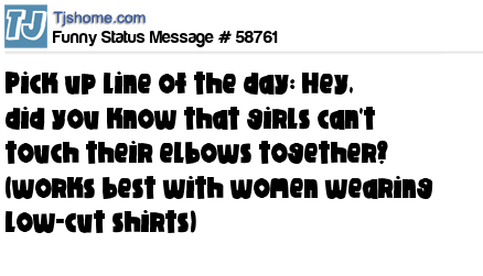 X Pick up line of the day: Hey, did you know that girls can't touch their elbows together? (works best with women wearing low-cut shirts)