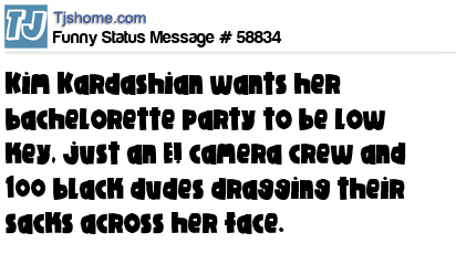 X says Kim Kardashian wants her bachelorette party to be low key, just an E! camera crew and 100 black dudes dragging their sacks across her face.