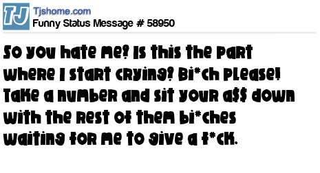 X So you hate me? Is this the part where I start crying? Bi*ch please! Take a number and sit your a$$ down with the rest of them bi*ches waiting for me to give a f*ck.