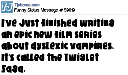 X says I've just finished writing an epic new film series about dyslexic vampires. It's called the Twiglet Saga.