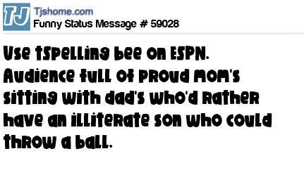 - # 59029 Spelling bee on @espn. Audience full of proud mom's sitting with dad's who'd rather have an illiterate son who could throw a ball