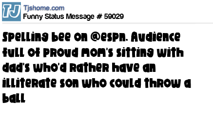 X Spelling bee on @espn. Audience full of proud mom's sitting with dad's who'd rather have an illiterate son who could throw a ball