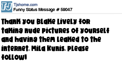 X is thank you Blake Lively for taking nude pictures of yourself and having them leaked to the internet, Mila Kunis, please follow!