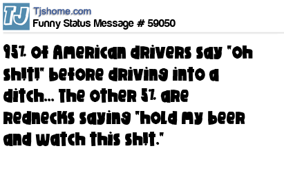 X 95% of American drivers say "oh sh!t!" before driving into a ditch... The other 5% are rednecks saying "hold my beer and watch this sh!t."
