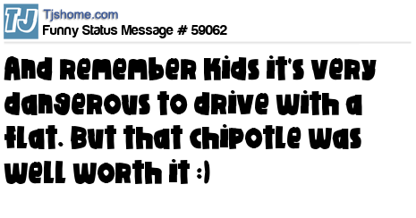 X is And remember kids it's very dangerous to drive with a flat. But that chipotle was well worth it :)