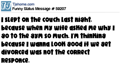 X i slept on the couch last night, because when my wife asked me why I go to the gym so much. I'm thinking because I wanna look good if we get divorced was not the correct responce.