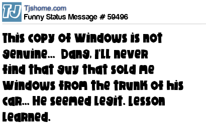 X says This copy of Windows is not genuine... Dang, I'll never find that guy that sold me Windows from the trunk of his car... He seemed legit. Lesson learned.