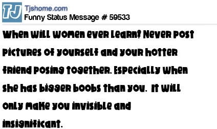 X is When will women ever learn? Never post pictures of yourself and your hotter friend posing together. Especially when she has bigger boobs than you. It will only make you invisible and insignificant.