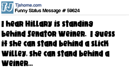 X I hear Hillary is standing behind Senator Weiner. I guess if she can stand behind a slick Willey, she can stand behind a Weiner...