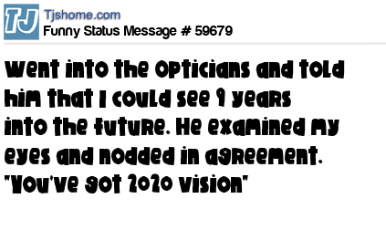 X Went into the Opticians and told him that I could see 9 years into the future. He examined my eyes and nodded in agreement. "You've got 2020 vision"