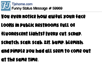 X You ever notice how awful your face looks in public restrooms full of fluorescent lights? Every cut, scrap, scratch, scar, scab, zit, bump, blemish, and pimple you had all seem to come out at the same time.
