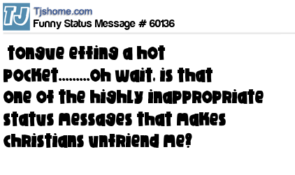 X is tongue effing a hot pocket.........oh wait, is that one of the highly inappropriate status messages that makes christians unfriend me?