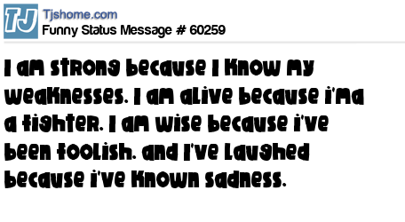 - # 30799 I am strong coz I have been weak, I am beautiful coz I know my flaws, I am a lover coz I am a fighter, I am fearless coz I have been afraid. I am wise coz I have been foolish & I can laugh coz I have also known sadnes, I know my past yet I can c my future