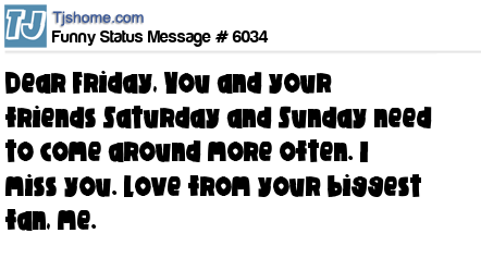X Dear Friday, You and your friends Saturday and Sunday need to come around more often. I miss you. Love from your biggest fan, me.