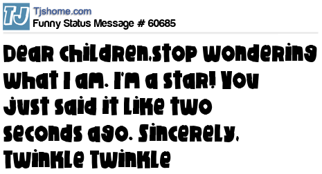 X Dear children,stop wondering what I am. I'm a star! You just said it like two seconds ago. Sincerely, Twinkle Twinkle