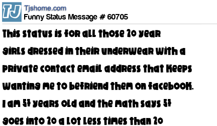 X is This status is for all those 20 year girls dressed in their underwear with a private contact email address that keeps wanting me to befriend them on facebook. I am 57 years old and the math says 57 goes into 20 a lot less times than 20 into 20. Denied