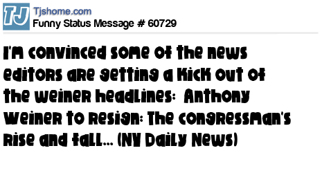 X I'm convinced some of the news editors are getting a kick out of the weiner headlines: Anthony Weiner to resign: The congressman's rise and fall... (NY Daily News)