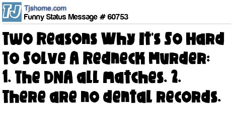 - # 56730 Two Reasons Why It's So Hard To Solve A Redneck Murder: 1. The DNA all matches. 2. There are no dental records.