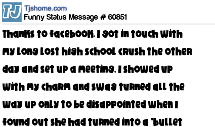 X is Thanks to facebook, I got in touch with my long lost high school crush the other day and set up a meeting. I showed up with my charm and swag turned all the way up only to be disappointed when I found out she had turned into a "bullet I dodged"