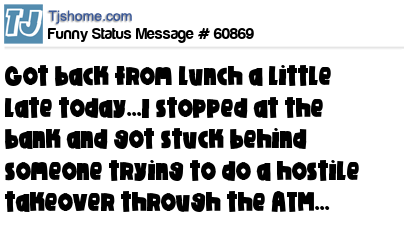 X is Got back from lunch a little late today...I stopped at the bank and got stuck behind someone trying to do a hostile takeover through the ATM...