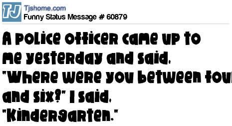 - # 184038 A police officer came up to me yesterday and said, "Where were you between four and six?" I said, "Kindergarten." I need bail money now