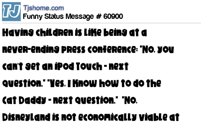X Having children is like being at a never-ending press conference: "No, you can't get an iPod Touch - next question." "Yes, I know how to do the Cat Daddy - next question." "No, Disneyland is not economically viable at this time - next question."