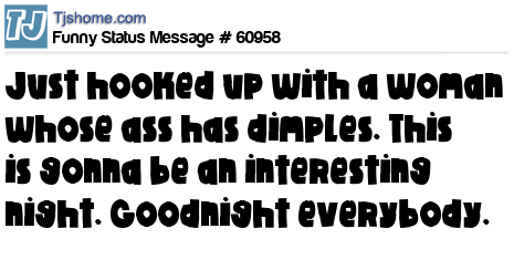 X is Just hooked up with a woman whose ass has dimples. This is gonna be an interesting night. Goodnight everybody.