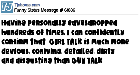 X is Having personally eavesdropped hundreds of times, I can confidently confirm that GIRL TALK is much more devious, coniving, detailed, dirty and disgusting than GUY TALK