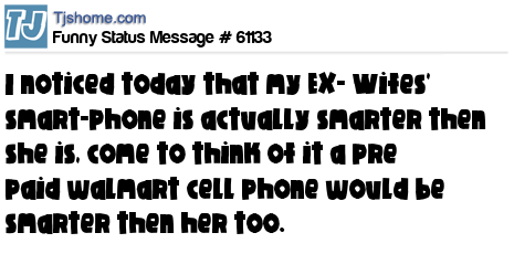 X says I noticed today that my EX- Wifes' smart-phone is actually smarter then she is, come to think of it a pre paid walmart cell phone would be smarter then her too.
