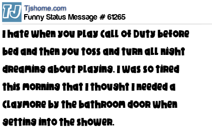 X I hate when you play Call of Duty before bed and then you toss and turn all night dreaming about playing. I was so tired this morning that I thought I needed a Claymore by the bathroom door when getting into the shower.