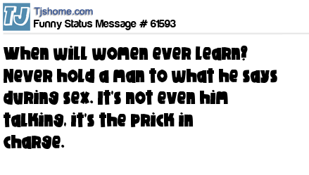 X is When will women ever learn? Never hold a man to what he says during sex. It's not even him talking, it's the prick in charge.