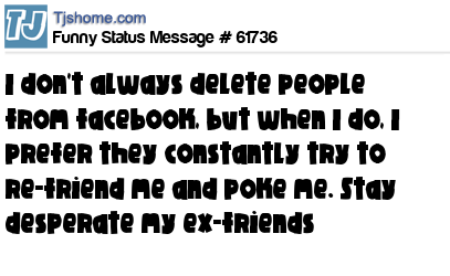 X I don't always delete people from facebook, but when I do, I prefer they constantly try to re-friend me and poke me. Stay desperate my ex-friends