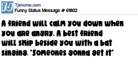 - # 26972 a friend will calm you down when you're angry, but a best friend will skip beside you with a baseball bat singing "someone's gonna get it!"
