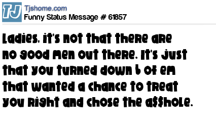 - # 64238 Ladies, it's not that there are no good men out there. It's just that you turned down 6 of em that wanted a chance to treat you right and you chose the a$$hole.