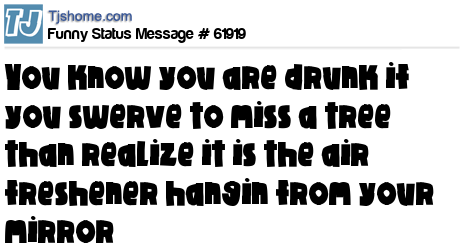 - # 210662 You know you're too drunk to drive when you swerve to miss a tree, and then realize it was just your air freshener hanging from the rear view mirror