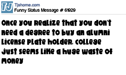 X says Once you realize that you don't need a degree to buy an alumni license plate holder, college just seems like a huge waste of money