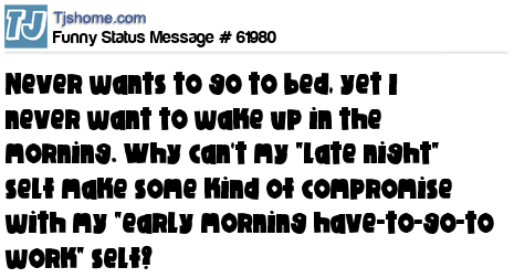 X never wants to go to bed, yet I never want to wake up in the morning. Why can't my "late night" self make some kind of compromise with my "early morning have-to-go-to work" self?