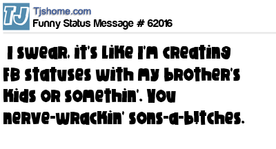 X is I swear, it's like I'm creating FB statuses with my brother's kids or somethin'. You nerve-wrackin' sons-a-b!tches.