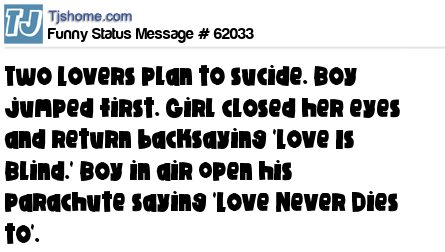 X is Two Lovers plan to sucide. Boy jumped first. Girl closed her eyes and return backsaying 'Love Is Blind.' Boy in air 0pen his parachute saying 'Love Never Dies to'.