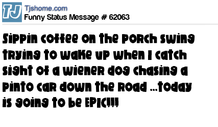 X was sippin coffee on the porch swing trying to wake up when I catch sight of a wiener dog chasing a pinto car down the road ...today is going to be EPIC!!!