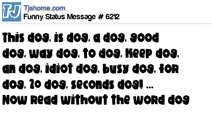- # 33876 This dog, is dog, a dog, good dog, way dog, to dog, keep dog, an dog, idiot dog, busy dog, for dog, 30 dog, seconds dog! … Now read without the word dog. (^_*)