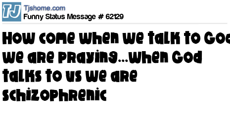 - # 10714 Why is it that when I talk to God I am said to be praying, but when God talks to me I am said to be schizophrenic?