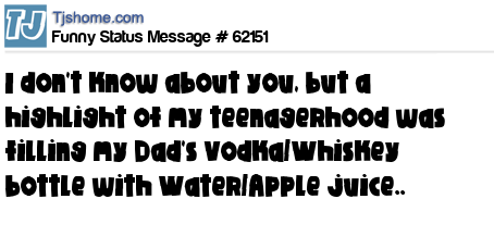 X says I don't know about you, but a highlight of my teenagerhood was filling my Dad's Vodka/Whiskey bottle with Water/Apple juice..