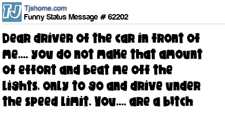 X Dear driver of the car in front of me.... you do not make that amount of effort and beat me off the lights, only to go and drive under the speed limit. You.... are a b!tch