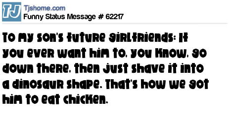 X is To my son's future girlfriends: If you ever want him to, you know, go down there, then just shave it into a dinosaur shape. That's how we got him to eat chicken.