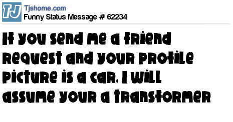 - # 67125 If you friend request me on facebook and your profile picture is a car, I will assume you're a transformer.