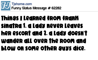 X things I learned from frank sinatra 1. a lady never leaves her escort and 2. a lady doesn't wander all over the room and blow on some other guys dice.