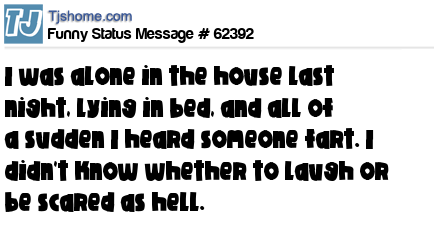 X I was alone in the house last night, lying in bed, and all of a sudden I heard someone fart. I didn't know whether to laugh or be scared as hell.